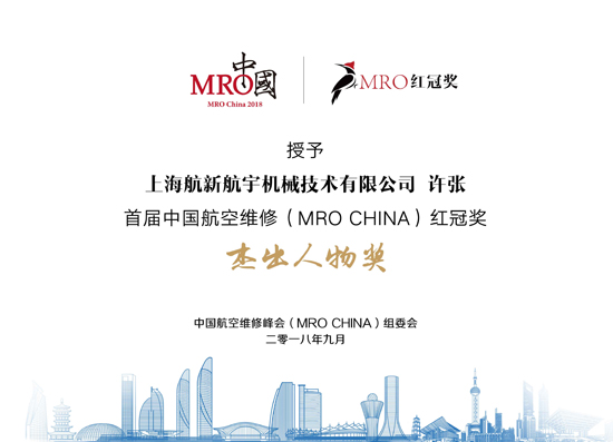 在9月26日召开的2018年中国航空维建峰会(MRO CHINA 2018)上,,,,,,,,上海JDB电子官网航宇机械技术有限公司总经理许张荣获首届中国航空维建(MRO CHINA)红冠奖之“卓越人物奖”。。。。。